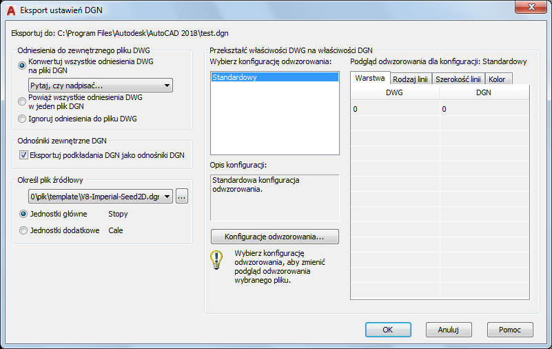 Wyświetla listę wszystkich właściwości eksportowanego pliku DWG (w kolumnie DWG) i wybranej konfiguracji odwzorowania (w kolumnie DGN).
