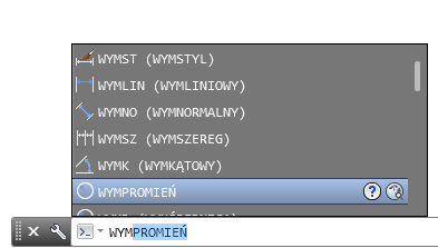 Po rozpoczęciu wpisywania w wierszu polecenia nazwy polecenia lub zmiennej systemowej dostępne opcje są wyświetlane przez funkcję autouzupełniania. Na przykład po wprowadzeniu wymiar wyświetlane są wszystkie polecenia i zmienne systemowe rozpoczynające się od tych liter, tak jak pokazano na rysunku.