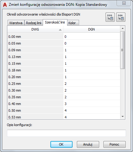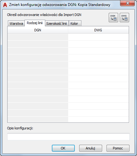 Eksport konfiguracji odwzorowania: Jeśli dostęp do okna dialogowego Zmień konfigurację odwzorowania DGN uzyskano przez utworzenie nowej konfiguracji w oknie dialogowym Eksport ustawień DGN, kolumna DWG zawiera wszystkie zdefiniowane rodzaje linii w bieżącym pliku rysunku. Zawsze gdy docelowa komórka jest pusta (kolumna z prawej strony), będzie używane domyślne odwzorowanie systemowe.