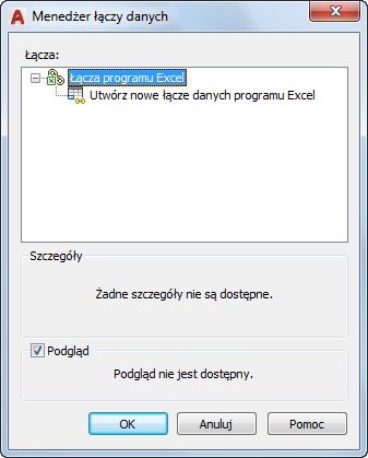Wyświetla podgląd dołączonych danych w postaci, w jakiej będą widoczne w tabeli rysunku. Gdy łącze danych nie jest zaznaczone, podgląd nie pojawi się.