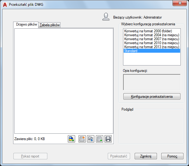 Otwiera standardowe okno dialogowe wyboru plików, w którym można wybrać pliki rysunków w celu dodania do listy konwersji. Przycisk ten jest dostępny na obu kartach, Drzewo plików i Tabela plików.