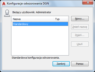 Umożliwia tworzenie, zmianę nazwy, modyfikowanie i usuwanie konfiguracji odwzorowania importu lub eksportu danych DGN.