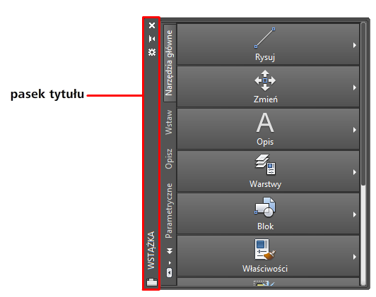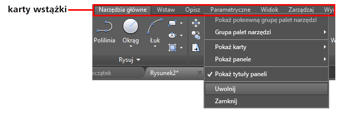 - Kliknij pasek tytułu i przeciągnij uwolnioną wstążkę do lewej, prawej lub górnej krawędzi obszaru rysunku