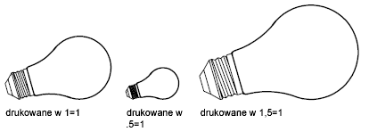 Ilustracje przedstawiają żarówkę wydrukowaną w trzech różnych skalach.