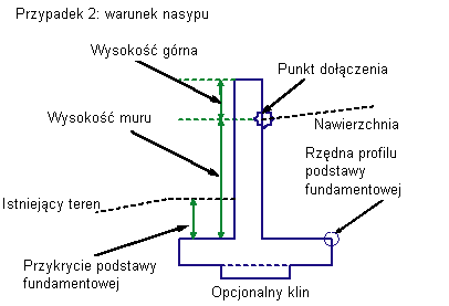 | Przykrycie podstawy fundamentowej | Głębokość przykrycia od szczytu podstawy do linii nachylenia końcowego po stronie tylnej muru w nasypie lub do punktu wyjściowego w wykopie. | Liczbowy |