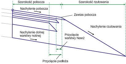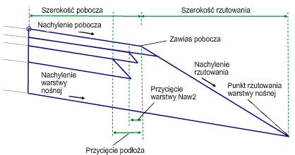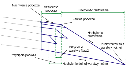 | Przycięcie warstwy Naw2 | Zredukowana szerokość materiału Naw2 w celu umożliwienia przeplatania warstwy nośnej. Boczna krawędź warstwy materiału będzie miała takie samo nachylenie, jak nachylenie rzutu pobocza. | Liczbowy, dodatni |