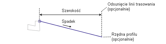 Nachylenie może być dane w % lub jako stosunek x : 1. Podczas budowy modelu korytarza można użyć linii trasowania, by umożliwić utworzenie zmiennej szerokości i nachylenia.