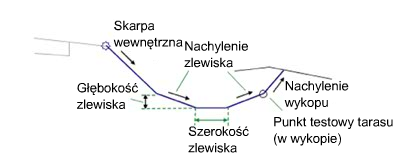 | Nachylenie skarpy wewnętrznej | Nachylenie połączenia skarpy wewnętrznej zlewiska | Liczbowy, dodatni | 3 ( : 1) |