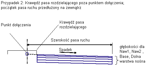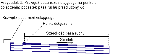Położenie wewnętrznej krawędzi jezdni obliczane jest na podstawie trzech przypadków pokazanych na poprzednim schemacie. Jeśli brak linii trasowania krawędzi pasa rozdzielającego lub linia trasowania nie została znaleziona przy pikiecie, wewnętrzna krawędź utrzymywana jest przy punkcie dołączenia (przypadek 1). Jeśli istnieje linia trasowania krawędzi pasa rozdzielającego i znajduje się ona na zewnątrz punktu dołączenia pasa, wewnętrzna krawędź przesuwana jest na zewnątrz od punktu dołączenia przy nachyleniu pasa ruchu (przypadek 2). Jeśli linia trasowania krawędzi pasa rozdzielającego znajduje się wewnątrz punktu dołączenia pasa, wewnętrzna krawędź przesuwana jest do wewnątrz od punktu dołączenia przy nachyleniu pasa ruchu (przypadek 3).