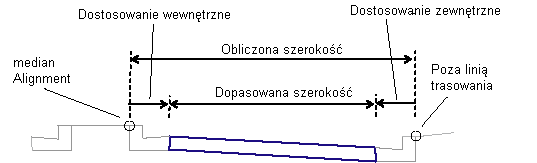 Dostosowanie wewnętrzne i zewnętrzne: parametry Dostosowanie wewnętrzne oraz Dostosowanie zewnętrzne wykorzystywane są, gdy linia trasowania użyta dla krawędzi pasa rozdzielającego lub krawędzi pasa ruchu znajduje się przy stałym odsunięciu od rzeczywistej krawędzi jezdni. Na przykład linia trasowania używana dla krawędzi pasa rozdzielającego może znajdować się z tyłu krawężnika zamiast przy krawędzi nawierzchni drogi. W tym przypadku ustawiona wartość parametru Dostosowanie wewnętrzne powinna być równa szerokości krawężnika.