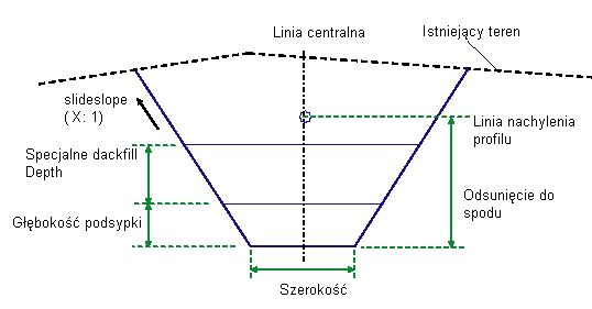 Obliczana jest rzędna spodu rowu jako rzędna linii nachylenia profilu pomniejszona o wartość Odsunięcia do spodu. Na tej rzędnej, symetrycznie względem odsunięcia punktu dołączenia, umieszczane jest poziome połączenie spodu rowu i wydłużane są w górę, do istniejącej powierzchni, stoki boczne. Nad spodem rowu, zgodnie z daną głębokością, umieszczane jest poziome połączenie Podłoża. Nad połączeniem Podłoża, zgodnie z daną głębokością, umieszczane jest poziome połączenie Specjalnej zasypki.