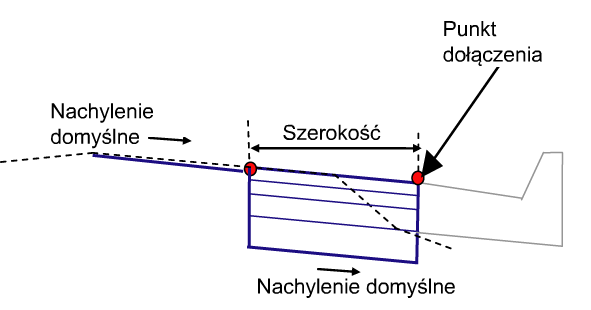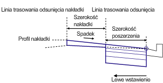 Punkt dołączenia określa odsunięcie i rzędną zewnętrznej krawędzi poszerzenia. Położenia wewnętrznej krawędzi poszerzenia i wewnętrznej krawędzi nakładki są określane przy użyciu danych wartości szerokości i nachylenia. Do nadpisania danych liczbowych wartości szerokości można użyć linii trasowania. Jeśli parametr Profil nakładki jest dany, wówczas nachylenie jest obliczane między rzędną profilu przy wewnętrznej krawędzi nakładki a punktem dołączenia.
