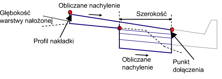 Na poniższym rysunku pokazano sytuację z profilem odsunięcia nakładki. (jeśli parametr Profil nakładki jest dany, nachylenie jest obliczane między rzędną profilu przy wewnętrznej krawędzi nakładki a punktem dołączenia).