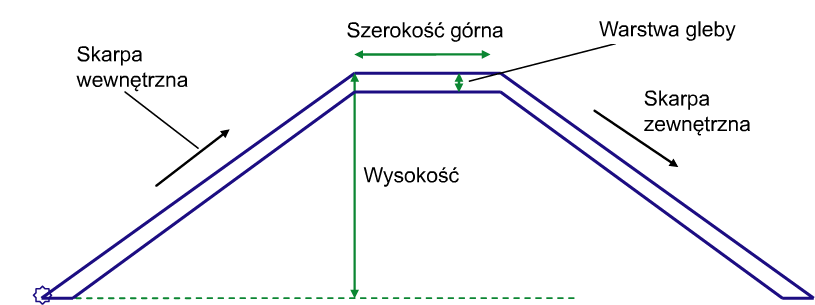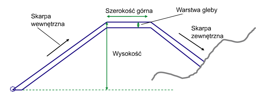 | Skarpa wewnętrzna | Nachylenie domyślne połączenia skarpy wewnętrznej bariery. | Liczbowy | 1:1.5 |