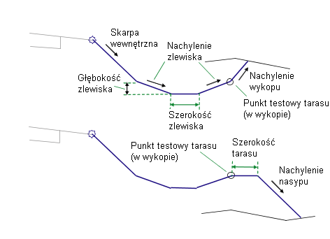 Za pomocą tego podzespołu wstawiane są połączenia tworzące zlewisko i nachylenie rzutowania wykopu w warunku wykopu lub zlewisko, taras i skarpę nasypu w warunku nasypu.