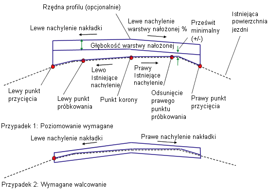 Odsunięcie punktu korony. Korona oraz punkty próbkowania używane są do obliczenia lewego i prawego nachylenia istniejącej jezdni. |