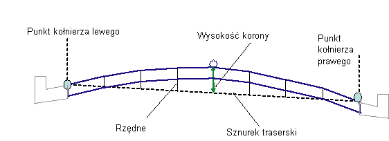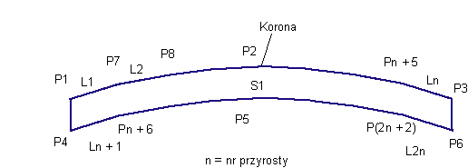 Następnie, przez połączenie lewego i prawego punktu kołnierzowego (czyli nowo utworzone krawędzie jezdni) definiowany jest sznurek traserski. Sznurek traserski dzielony jest przez wartość parametru „liczba przyrostów”, a środkowy przyrost przyjmowany jest jako odsunięcie „punktu korony”. Rzędna punktu korony wyznaczana jest przez dodanie parametru „wysokość korony” do rzędnej środka sznurka traserskiego.