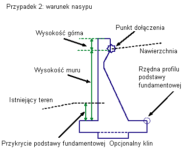 | Przykrycie podstawy fundamentowej | Głębokość przykrycia od szczytu podstawy do linii nachylenia końcowego po stronie tylnej muru w nasypie lub do punktu wyjściowego w wykopie. | Liczbowy |