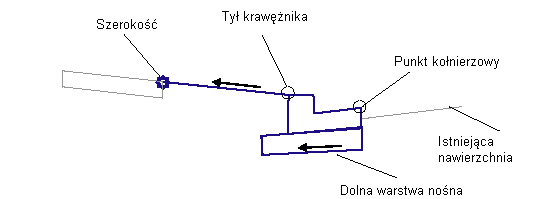 | Wewnętrzna krawędź chodnika | Ustawiana jest wartość odsunięcia punktu wyższej strony pasa darniny. Następujące typy obiektów można zastosować jako obiekty docelowe do określania tego odsunięcia: linie trasowania, polilinie, linie charakterystyczne lub figury pomiarowe. |