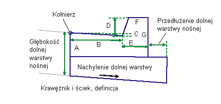 W oparciu o parametry wejściowe: Wymiar A — Wymiar F wstawiane są wszystkie pozostałe połączenia krawężnika i ścieku. Wszystkie wymiary muszą być dodatnie, niezerowe. Jeśli dana jest niezerowa głębokość dolnej warstwy nośnej, jest ona wstawiana do tyłu krawężnika i wydłużana o szerokość Przedłużenia nośnego. Dolna warstwa nośna zostaje zamknięta do krawędzi spodu i tyłu krawężnika, jak pokazano na schemacie.