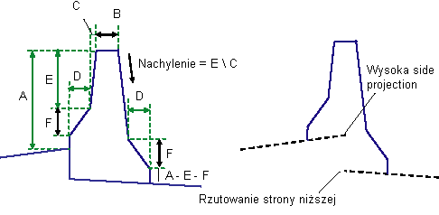 Nachylenie prawe i nachylenie lewe są obliczane między punktami próbkowania na każdej stronie. Przy tych nachyleniach, od punktów wycięcia wydłużane są linie do wewnątrz, do osi. W oparciu o stronę z najwyższą rzędną na osi wyznaczana jest strona kontrolująca minimalną wysokość bariery.