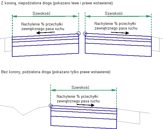 Za pomocą tego podzespołu tworzona jest reprezentacja przekroju poprzecznego pasa ruchu przy wykorzystaniu wartości nachylenia przechyłki pasa zewnętrznego lub wewnętrznego dla linii trasowania linii bazowej modelu korytarza.