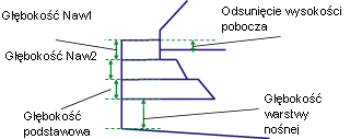Połączenia powierzchni Naw1, Naw2 i powierzchni bazowej wstawiane są na danych głębokościach równolegle do nachylenia końcowego. Jeśli wartości przedłużeń odpowiednich warstw są niezerowe, każda warstwa wydłużana jest o daną odległość poza punkt zawiasu pobocza. Każda warstwa powinna mieć co najmniej taką szerokość jak warstwa położona powyżej.