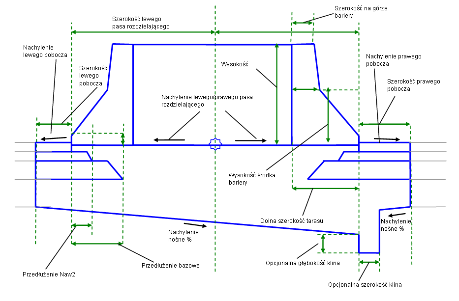 | Przedłużenie Naw2 po lewej stronie | Szerokość, o którą warstwa Naw2 jest przedłużona poza krawędź utwardzonego pobocza po lewej stronie pasa rozdzielającego. Jest podawana, nawet jeśli ustawiono zerową szerokość lewego pobocza. | Liczbowy, dodatni |