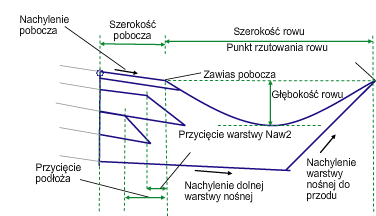 | Przycięcie warstwy Naw2 | Zredukowana szerokość materiału Naw2 w celu umożliwienia przeplatania warstwy nośnej. Boczna krawędź warstwy materiału będzie miała takie samo nachylenie, jak nachylenie rzutu pobocza. | Liczbowy, dodatni |