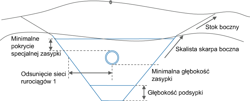 W obydwu przypadkach podzespół określa dno głębokości rowu i jego szerokość w oparciu o położenie rury lub rur w określonych sieciach. Wartość Minimalne pokrycie specjalnej zasypki jest określana od górnej zewnętrznej średnicy najwyższej rury wykrytej w próbkowanym przekroju. Wartość Minimalna głębokość specjalnej zasypki jest określana za pomocą dolnej zewnętrznej średnicy najniższej rury wykrytej w próbkowanej pikiecie. W zależności od tego, pod którą powierzchnią znajduje się skarpa boczna, używana jest odpowiednia skarpa (skalista lub zwykła).