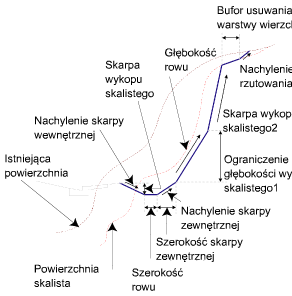 | Ograniczenie głębokości wykopu skalistego1 | Wysokość pierwszej skarpy wykopu skalistego | Liczbowy dodatni |