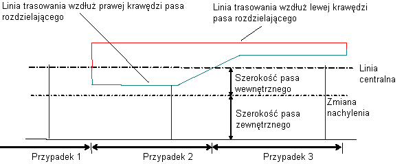 Linia trasowania definiująca tę krawędź może nie być (przypadek 1), albo może znajdować się ona na zewnątrz osi jezdni (przypadek 2) lub wewnątrz tej linii (przypadek 3).
