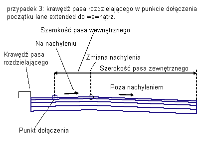 Wewnętrzna krawędź jezdni: położenie wewnętrznej krawędzi jezdni obliczane jest na podstawie trzech przypadków pokazanych na poprzednim schemacie. Jeśli istnieje linia trasowania krawędzi pasa rozdzielającego i znajduje się ona na zewnątrz punktu dołączenia pasa, wewnętrzna krawędź przesuwana jest na zewnątrz od punktu dołączenia przy nachyleniu pasa ruchu (przypadek 2). Jeśli linia trasowania krawędzi pasa rozdzielającego znajduje się wewnątrz punktu dołączenia pasa, wewnętrzna krawędź przesuwana jest do wewnątrz od punktu dołączenia przy nachyleniu pasa wewnętrznego (przypadek 3). Jeśli brak linii trasowania krawędzi pasa rozdzielającego lub linia trasowania nie została znaleziona przy pikiecie, wewnętrzna krawędź utrzymywana jest przy punkcie dołączenia (przypadek 1).