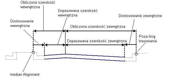 Dostosowanie wewnętrzne i zewnętrzne: parametry Dostosowanie wewnętrzne oraz Dostosowanie zewnętrzne wykorzystywane są, gdy linia trasowania użyta dla krawędzi wewnętrznej lub zewnętrznej znajduje się w stałym odsunięciu od rzeczywistej krawędzi jezdni. Na przykład linia trasowania używana dla krawędzi pasa rozdzielającego może znajdować się z tyłu krawężnika zamiast przy krawędzi nawierzchni drogi. W tym przypadku ustawiona wartość parametru Dostosowanie wewnętrzne powinna być równa szerokości krawężnika.