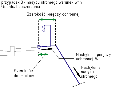 Szerokość połączenia poszerzenia poręczy ochronnej dla nachyleń nasypów, które korzystają z wartości nachylenia nasypu stromego. Zero, gdy brak poszerzenia poręczy ochronnej. |
