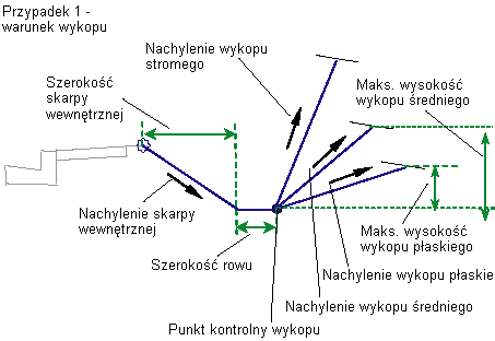 Nachylenie wykopu tworzone, gdy wartość parametru Nachylenie wykopu średniego przekracza wartość Maks. wysokość wykopu średniego |