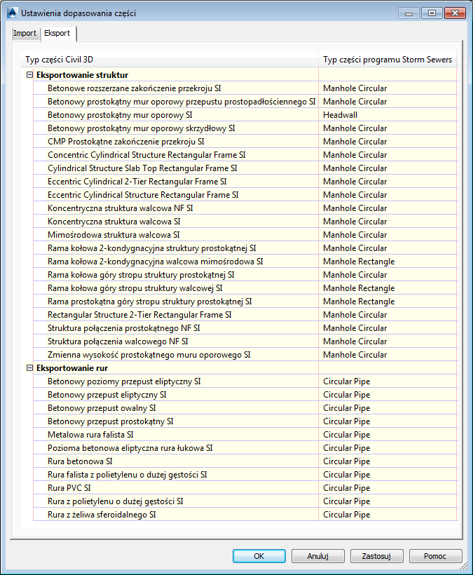 Karta Eksport, tak jak pokazano na rysunku poniżej, umożliwia wybór jednego z dostępnych typów części programu Storm Sewers (po prawej stronie) w celu dopasowania do każdego typu części z programu AutoCAD Civil 3D znalezionego w bieżącym katalogu części. Pokazane typy części programu AutoCAD Civil 3D są aktualizowane na podstawie zmian wprowadzonych w katalogu części.