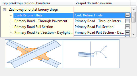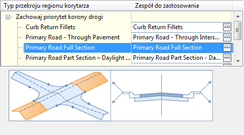 Ilustracje schematyczne w oknach dialogowych: przy każdym wybraniu właściwości lub elementu do edycji w oknach dialogowych edycji skrzyżowania ilustracje schematyczne wyświetlane w dolnej części okna dialogowego edycji zostaną zaktualizowane, wskazując położenie w przekroju, na które miała wpływ edycja.