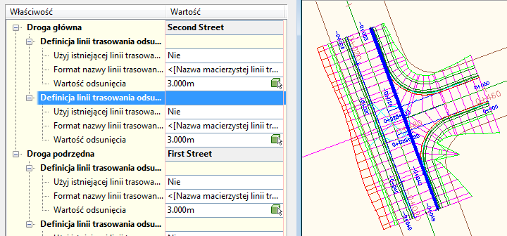 Linia trasowania odsunięcia po prawej stronie o nazwie Pierwsza ulica jest wybrana w oknie dialogowym Parametry odsunięcia skrzyżowania pokazanym po lewej stronie. W rysunku ta linia trasowania odsunięcia jest podświetlona.