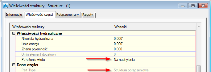 Wybranie obu opcji powoduje zastosowanie danych właściwości, łącznie z obliczonymi wartościami niwelet hydraulicznych i energetycznych do odpowiednich części.