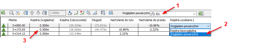 W przypadku linii charakterystycznej, które nie została wcześniej ustawiona jako względna do powierzchni, gdy otworzysz Edytor rzędnej skarpy, a następnie wybierzesz powierzchnię z listy Względem powierzchni, kolumna Rzędna uzyskana z zostanie początkowo ustawiona na wartość Rzędna bezwzględna dla wszystkich punktów i nie będzie się zmieniać automatycznie na wartość Względem powierzchni. Użyj listy rozwijanej, aby wybrać wartość Względem powierzchni dla punktów, które mają być względne.