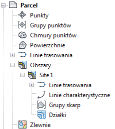 Aby wyświetlić lub zmodyfikować właściwości działki, należy kliknąć kartę Nawigator w oknie Obszar narzędzi, a następnie kliknąć działkę prawym przyciskiem myszy i wybrać polecenie . Na poniższym rysunku przedstawione są dwie działki: OPEN SPACE 100 i OPEN SPACE 101:
