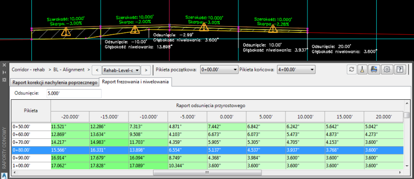 You can use the Rehab Manager to generate Cross Slope Correction and Milling and Leveling reports for selected stations within rehab corridor regions. You can make changes to values in the reports, and apply the changes back to the rehab corridor. For more information, see To Generate Rehab Corridor Reports.