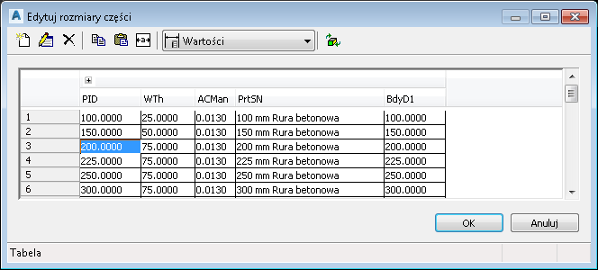 - Aby zmienić wartości rozmiarów rur, zaznacz wiersz i komórkę rozmiaru. Kliknij dwukrotnie, aby zmodyfikować wartość.