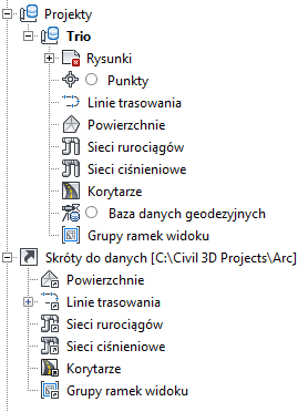 Rysunek przedstawia kolekcje projektu Vault o nazwie Trio oraz projekt skrótu do danych o nazwie Arc. Oba typy projektów są utworzone z domyślnego szablonu projektu. W rezultacie zawierają one identyczne kolekcje powierzchni, linii trasowania i innych obiektów, które mogą być dołączane jako odniesienia do wielu rysunków.