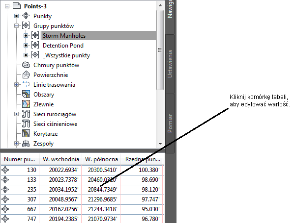 W przypadku niektórych obiektów, takich jak linie trasowania czy profile, w oknie Panorama znajduje się tabela elementów tworzących ten obiekt.