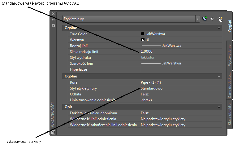 Edycja właściwości programu AutoCAD dla etykiety rury