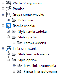 Na poniższym rysunku pokazano kolekcje ramek widoku i linii rzutowania w drzewie Ustawienia: