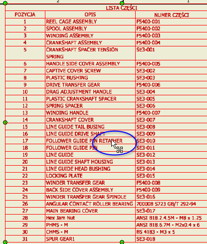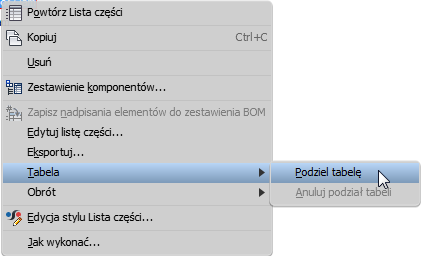 Istnieje możliwość podzielenia listy części, tabeli otworów, tabelki zmian lub ogólnej tabeli i przeniesienie podzielonej sekcji do nowej lokalizacji lub arkusza.