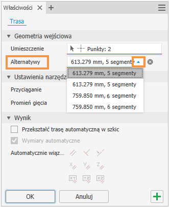 Po definicji geometrii końcowej na potrzeby utworzenia regionu trasy automatycznej, może istnieć wiele rozwiązań opartych na długości i ilości segmentów. Aby wyświetlić dostępne możliwości podczas tworzenia trasy, kliknij strzałkę menu rozwijanego Alternatywy.